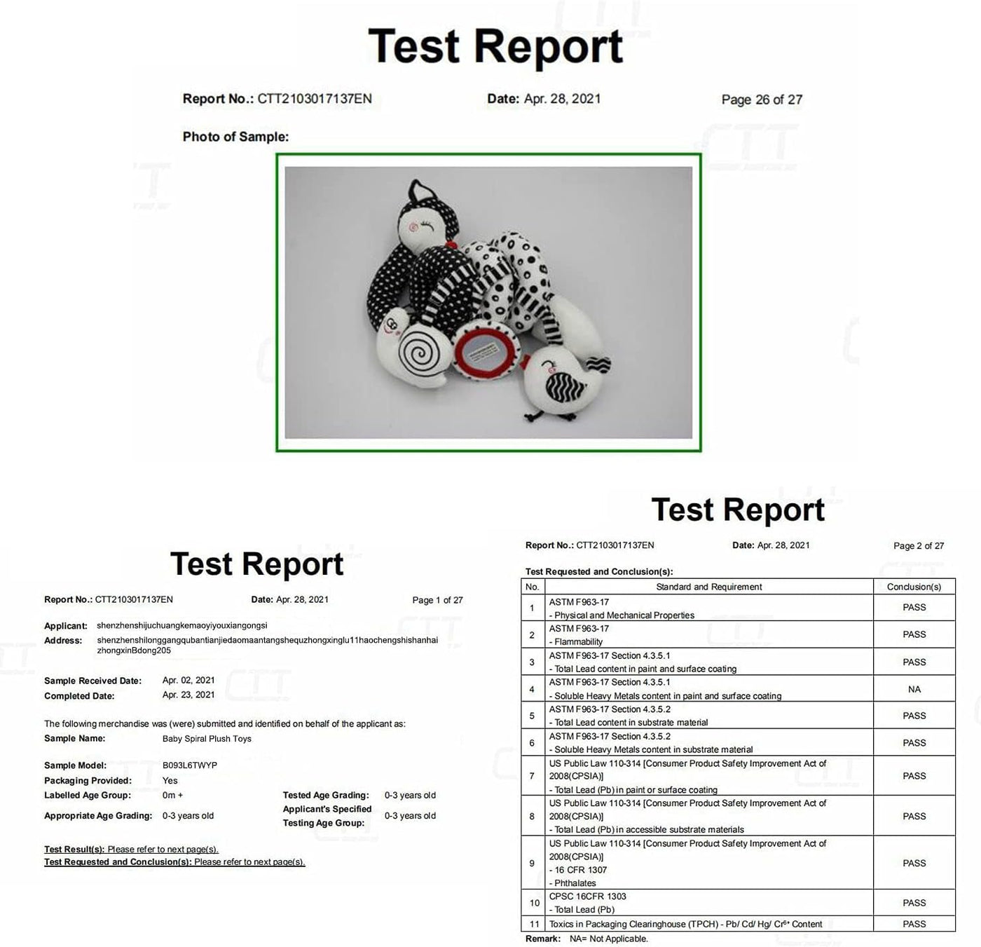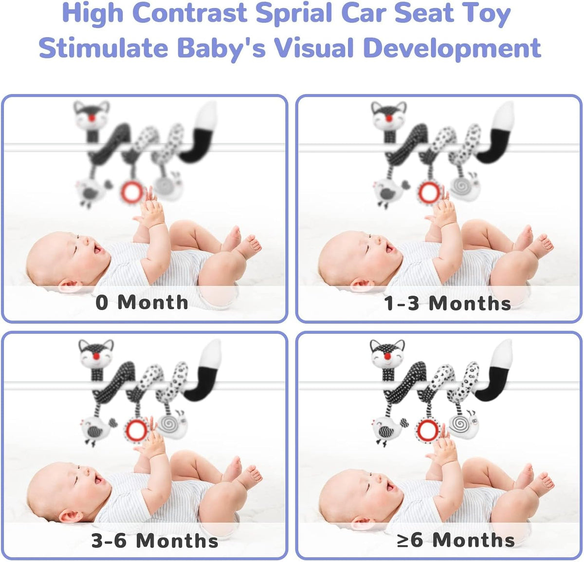 Product Description: The XIXILAND High-Contrast Spiral Baby Toy is thoughtfully designed to support newborn visual, auditory, and tactile development. Its plush animal toys – a squeaky chicken, a bell-carrying snail, and a mirror – encourage reaching, grabbing, and sensory play, while the high-contrast black and white design stimulates vision during the first months of life. Made from non-toxic, BPA-free materials and soft PP cotton, it’s safe for teething infants. The detachable plush toys can be hung on car seats, strollers, cribs, play gyms, or shopping carts, making this toy perfect for travel or home use. A thoughtful gift for infants and a helpful companion for safe, happy play.