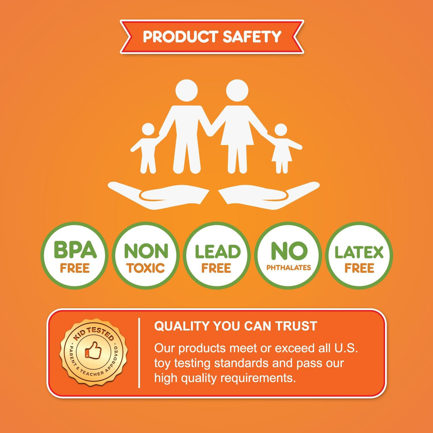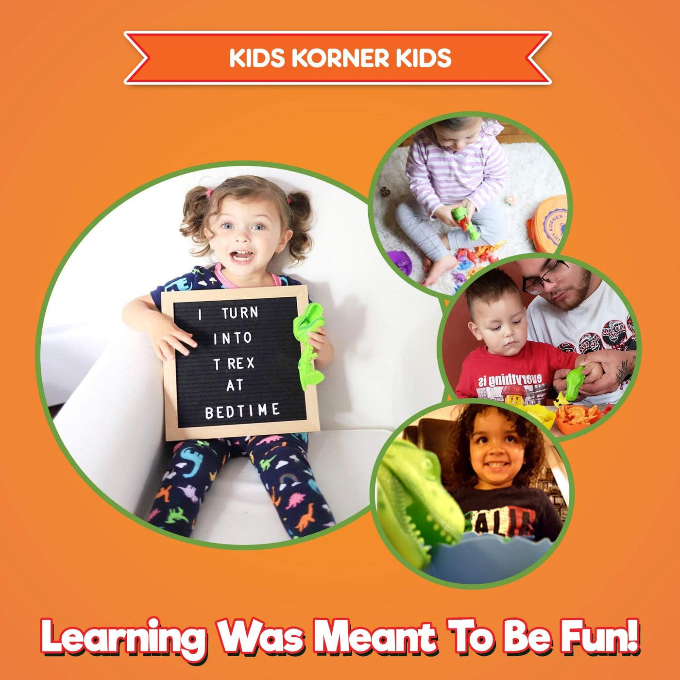 The set includes 48 soft, bendable dinosaurs, 6 silicone egg-shaped sorting cups, 2 wooden dice (one for colors and one for numbers), a T-Rex grabber tool, a convenient travel backpack, and a downloadable activity guide full of creative learning games.